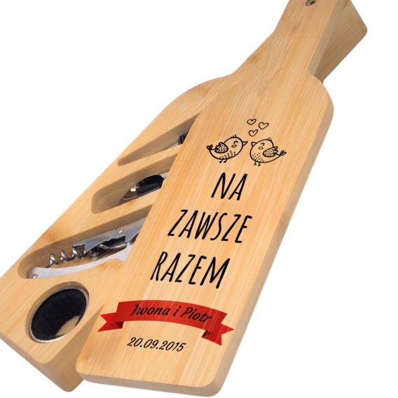 Bambusowe etui w kształcie butelki kryje w sobie komplet akcesoriów, które przydadzą się podczas świętowania rocznic, romantycznych kolacji czy wspólnych wieczorów przy winie. Dzięki personalizacji z imionami i datą produkt nabiera charakteru rodzinnej pamiątki, którą można postawić na honorowym miejscu w domu. Naturalny materiał, trwały nadruk i dopracowany projekt sprawiają, że to prezent, który z każdym rokiem będzie miał coraz większą wartość sentymentalną.