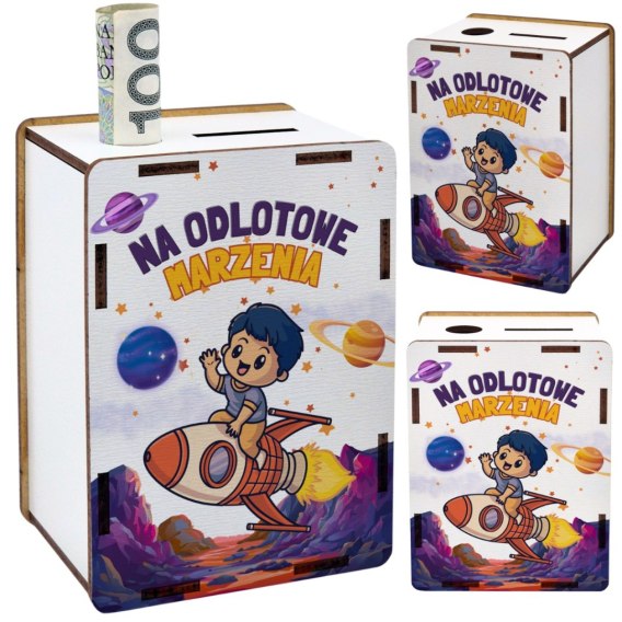 Oryginalny i wesoły prezent, który zachwyci każdego chłopaka! Drewniana skarbonka z kolorową grafiką „Odlotowy chłopak" i napisem „Na odlotowe marzenia" to świetny sposób, by uczyć dziecko oszczędzania w zabawny i motywujący sposób.