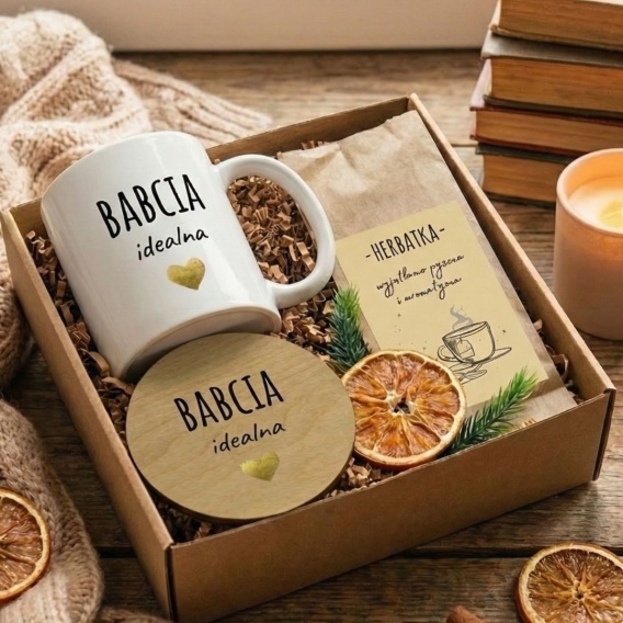 Szukasz wyjątkowego i gotowego do wręczenia prezentu na Dzień Babci? Ten elegancki zestaw został stworzony z myślą o chwili relaksu i codziennej przyjemności. Stylowy kubek z napisem „BABCIA IDEALNA", aromatyczna herbata z dodatkami oraz drewniany podstawek tworzą spójną, ciepłą kompozycję, która wywoła uśmiech i wzruszenie. Całość zapakowana jest w estetyczne pudełko z kolorową wstążką - idealne na prezent bez dodatkowego pakowania.